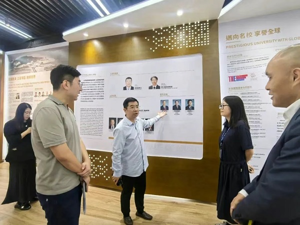 At Macau University of Science and Technology, the delegation met with Chuan Pang, Vice President and Dean of the Graduate School; Minghao Wang, Director of the FinTech Innovation Research Institute; and Jie Song, Assistant to the Dean. Following a study of General Secretary Xi's important inspection speech and a tour of the "Macau in Global Maps" exhibition, both parties discussed strategic cooperation in AI and finance.