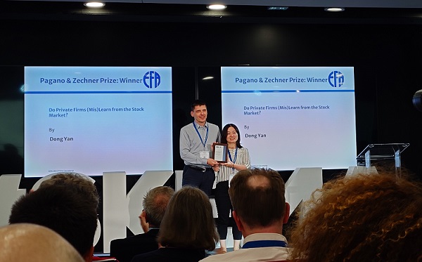 Professor Dong Yan, Long-Term Associate Professor of Finance at SAIF, received the prestigious 2025 Pagano & Zechner Prize for her solo-authored paper "Do Private Firms (Mis) Learn from the Stock Market?" She also served as a discussant in a parallel session. Additional SAIF faculty members―including Professors Jun Pan, Chen Chen, and Qiushi Huang―had papers selected for presentation at this premier academic conference.