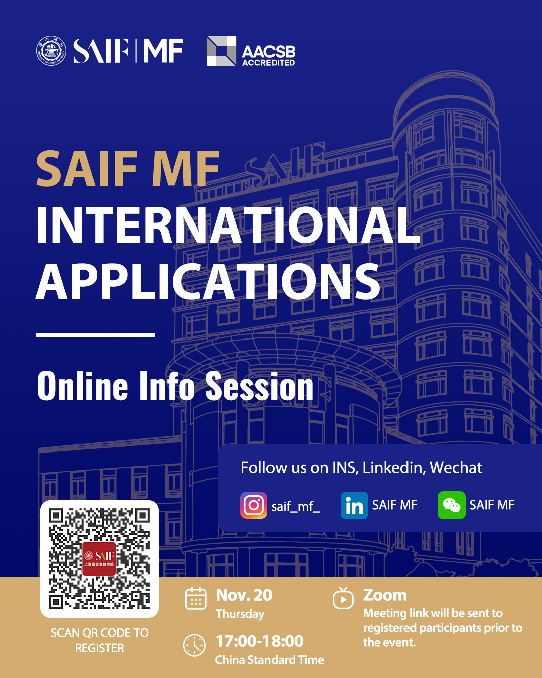 We invite you to join the SAIF Master of Finance (MF) Online Information Session on November 20 (Thursday), from 17:00 to 18:00 China Standard Time via Zoom.