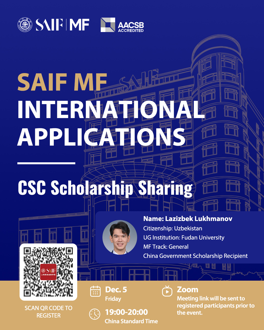 Join us to learn how our current student’s successful story of awarding the Chinese Government Scholarship and overall learning experience at the SAIF Master of Finance (MF) program on December 5 (Friday), from 19:00 to 20:00 China Standard Time via Zoom.