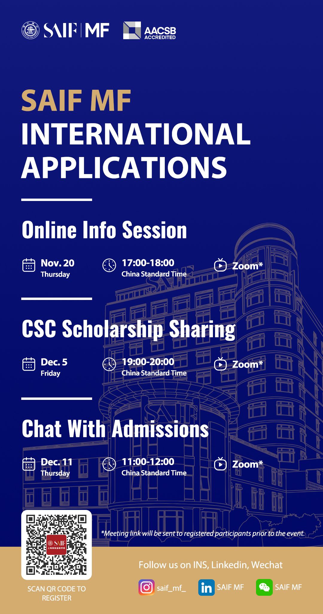We invite you to seize the opportunity to chat with SAIF MF Admissions to evaluate on the spot your background and readiness level for the program on December 11 (Thursday), from 11:00 to 12:00 China Standard Time via Zoom.